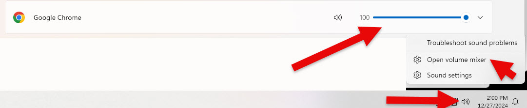 DON'T LIKE SOUND / MUSIC PLAYING ON WEB PAGES? Some of my pages have game related sounds and / or music that plays once and then stops (it does not loop). I have had a few Players express that they do not like the sounds and that they are too loud. The volume for sounds on my pages are set intentionally low, but the volume level can also be increased by your browser / volume settings. You can address this situation, as noted below. If you don't want to hear music / sounds on a web page, you can 'pause' the sound from the top right of some browsers, such as Google Chrome (see image on left, below). This will only apply to the web page that you currently have open in your browser. This option is not permanent and will reset once you navigate away from a web page. You can also adjust the sound volume for your Browser by right clicking on the Speaker Icon on your task bar, selecting 'Open volume mixer' and then use the volume scroll bar to adjust the volume for your browser (see image on right, below). This is a permanent setting that will apply to all web sites, to include You Tube, etc.; however, you can go back and re-adjust the setting at will.